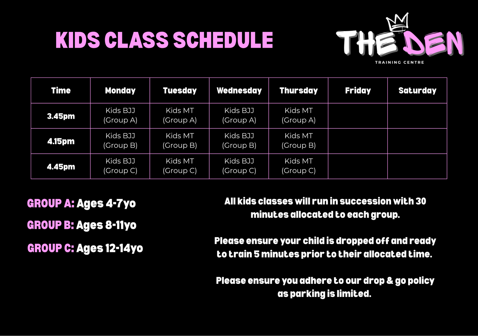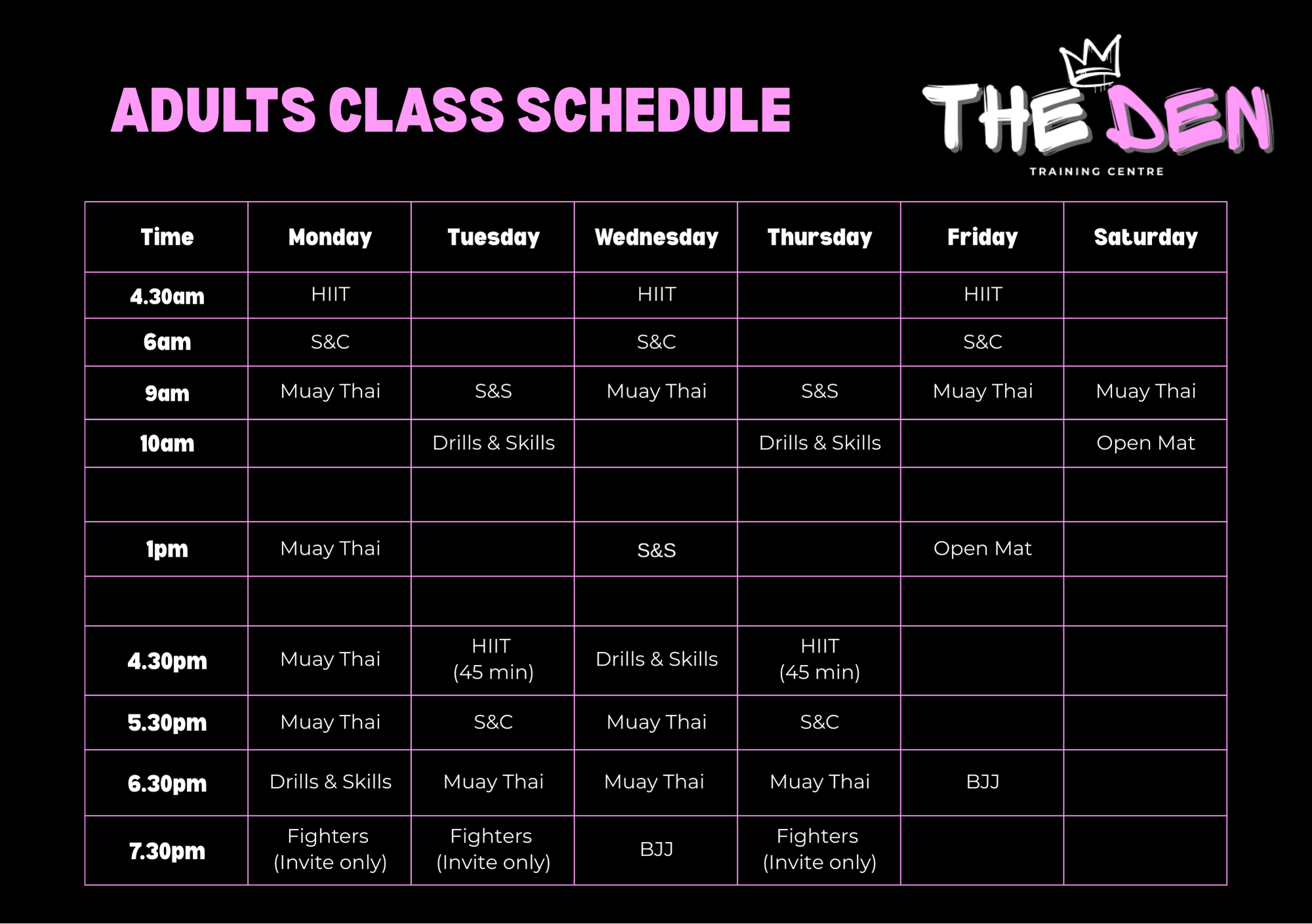 For our adults: BJJ, Strength & Conditioning, Strength & Strike (half strength, half Muay Thai), Drills & Skills (fundamental skills), Muay Thai & HIIT. -